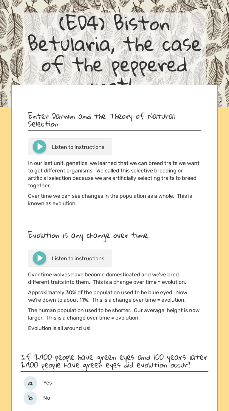 Simulate changes in moth population due to pollution and predation, and observe how . View peppered moth game worksheet.docx from bio 121l at coastal carolina university. Peppered moths rest on silver birch tree trunks with their wings outstretched, this behaviour can make them easy prey for birds. Scientists became curious why this was happening. It decreased the number of birds in the environment so predation of moths was less. Why is the peppered moth phenomenon uncommon? Students track the changes of the peppered moth's appearance over time and. Simulate changes in moth population due to pollution and predation, and observe how species can change over time. Work in pairs or independently to complete the storyboard in the worksheet. Read article about natural selection in peppered moths. Then complete the double line graph. Name __________emily andrews_________ peppered moth game objective: After your graph is complete answer the following .